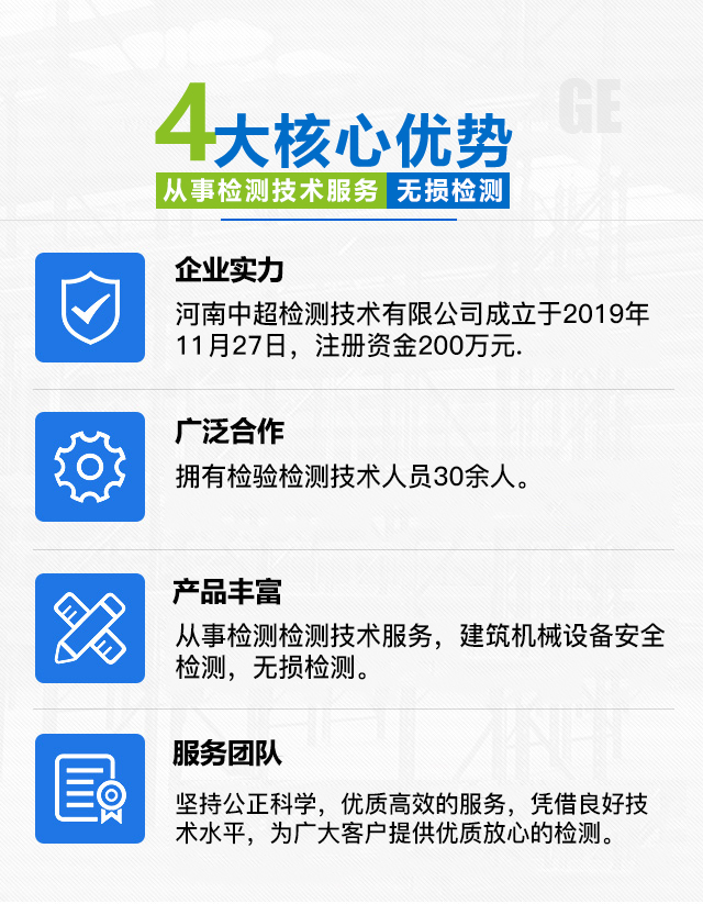 河南中超检测技术有限公司成立于2019年11月27日,注册资金200万元.从事检验检测技术服务,建筑机械设备安全检测,无损检测。主要检测项目有“两工地”塔式起重机,施工升降机,高处作业吊篮,附着式升降脚手架,桥式起重机,门式起重机,防坠器等;石油化工装置、天然气管道、储罐检测;机械制造铸件、结构件检测。公司现有各级检验检测人员30余人,检验师4人,检验员20余人;检验设备精良,包括经纬仪、水准仪、钢丝绳探伤仪、超声波测厚仪、便携式磁粉探伤仪、X射线机、管道爬行器、TOFD设备等。