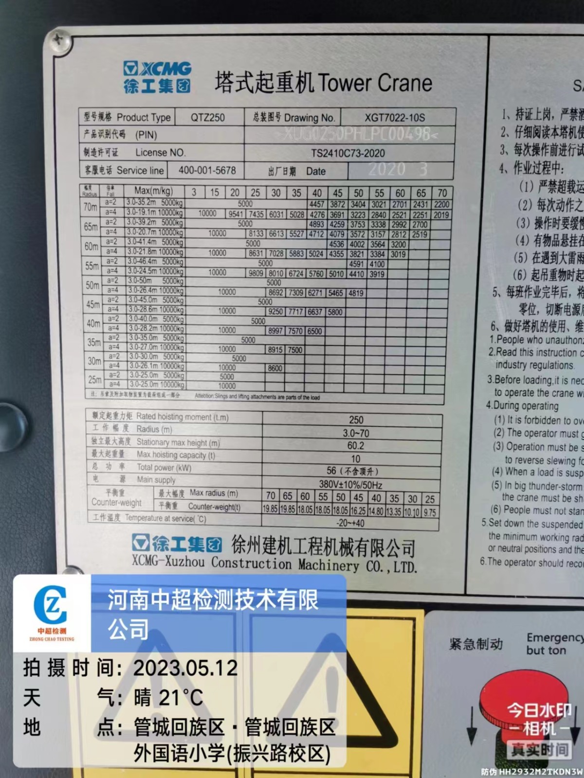 | 出厂编号:XUG0250PHLPC00498 | |