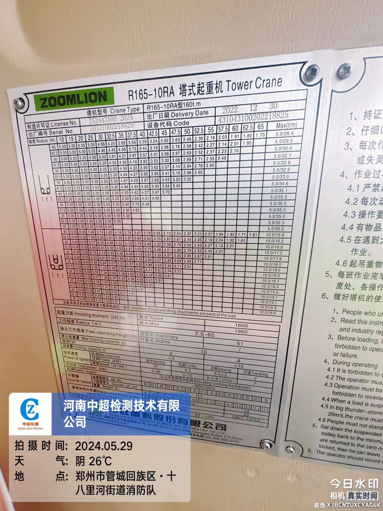 | 工程名称:郑州市刘湾水厂扩建工程土建工程施工二标段2#塔吊 | |