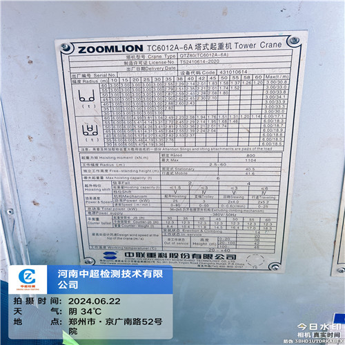 | 工程名称:郑州市农业科技创新中心建设项目2#塔吊 | |