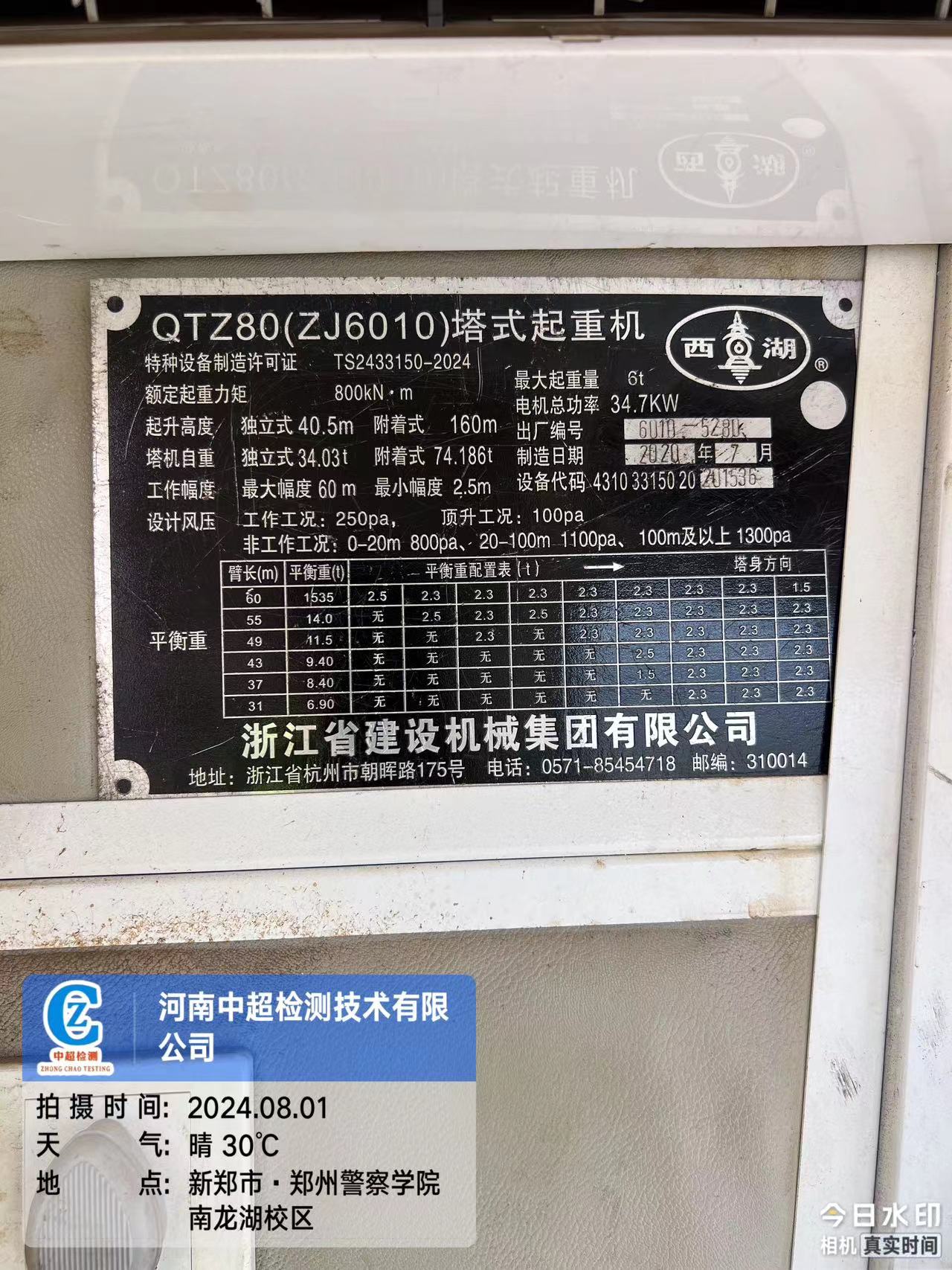 工程名称:郑州警察学院校区建设工程主体三标段19-1#塔吊