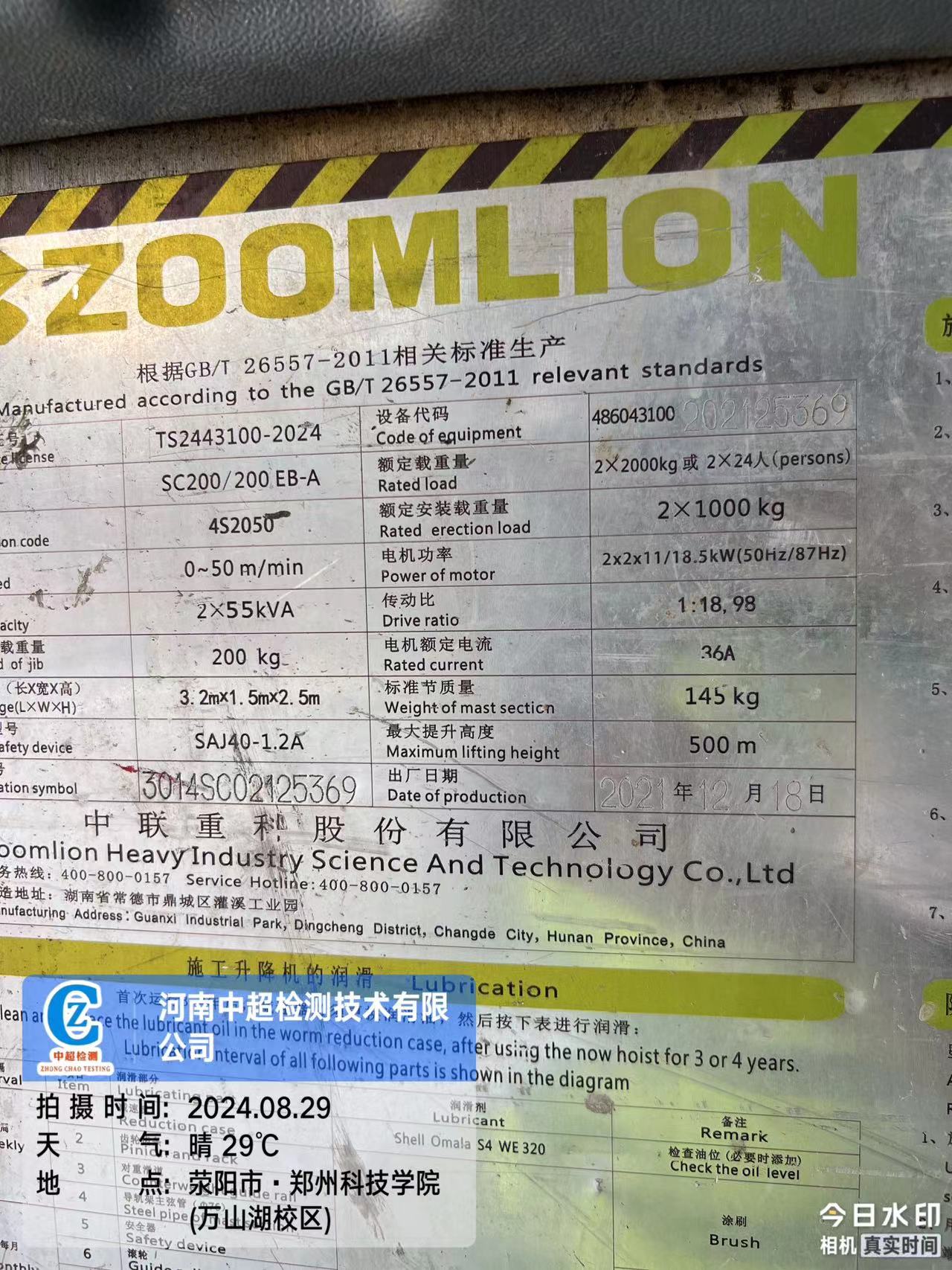 | 工程名称:郑州科技学院国际教育学院建设项目万山湖校区一期(一标段2#施工升降机) | |