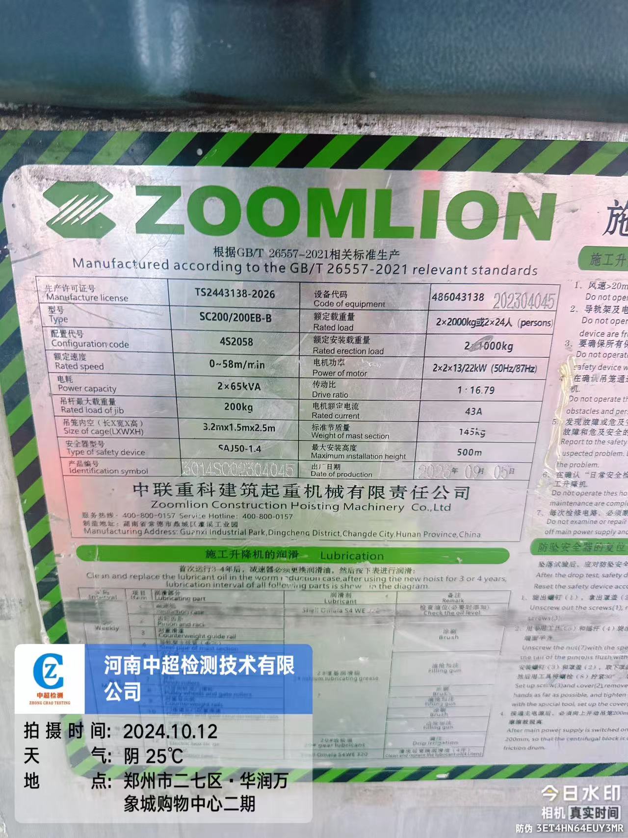 | 安装单位:郑州市鸿泰建筑设备租赁有限公司 | |