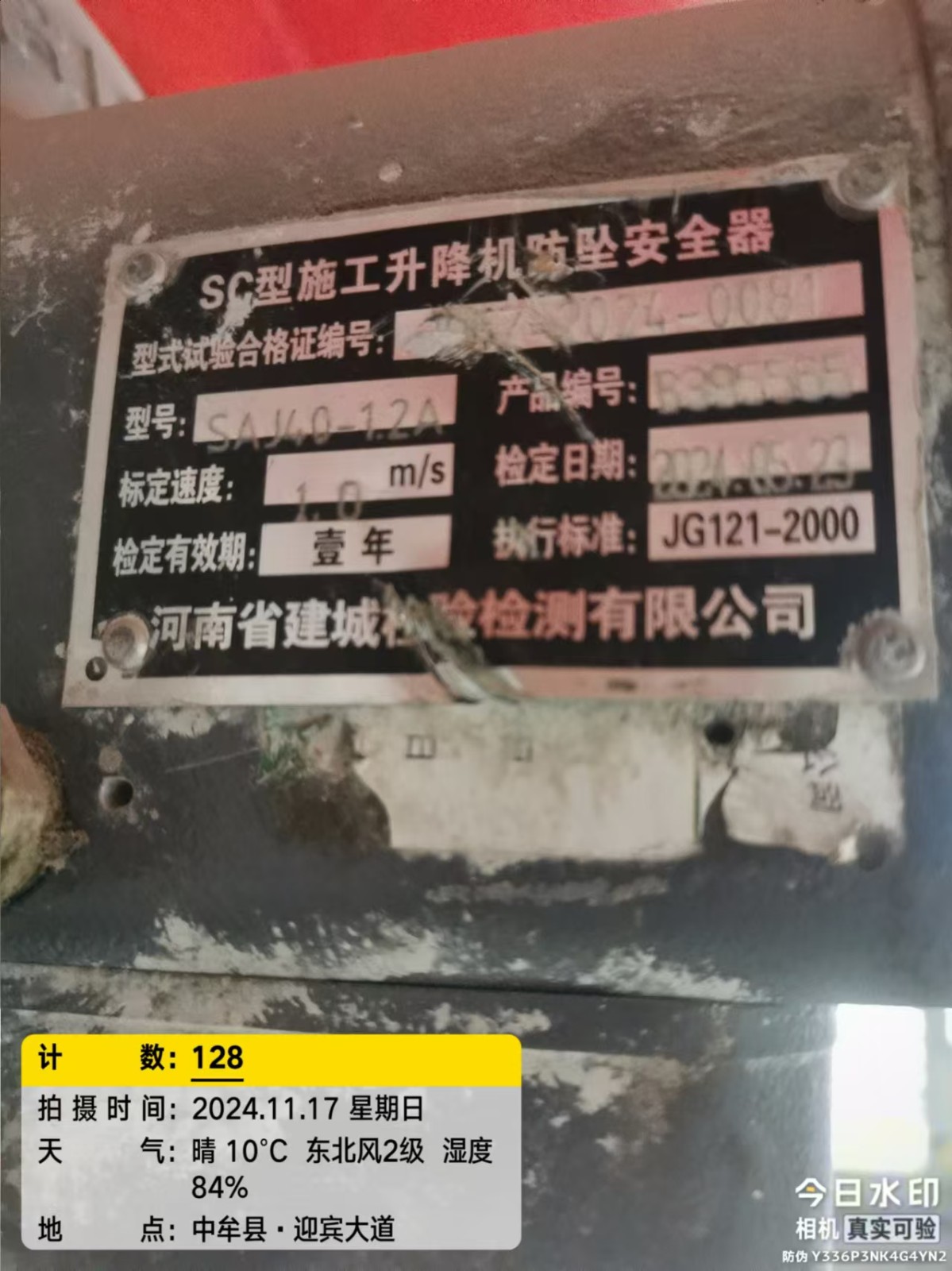 | 工程名称:郑州猪肉产业园2号楼B1施工升降机 | |