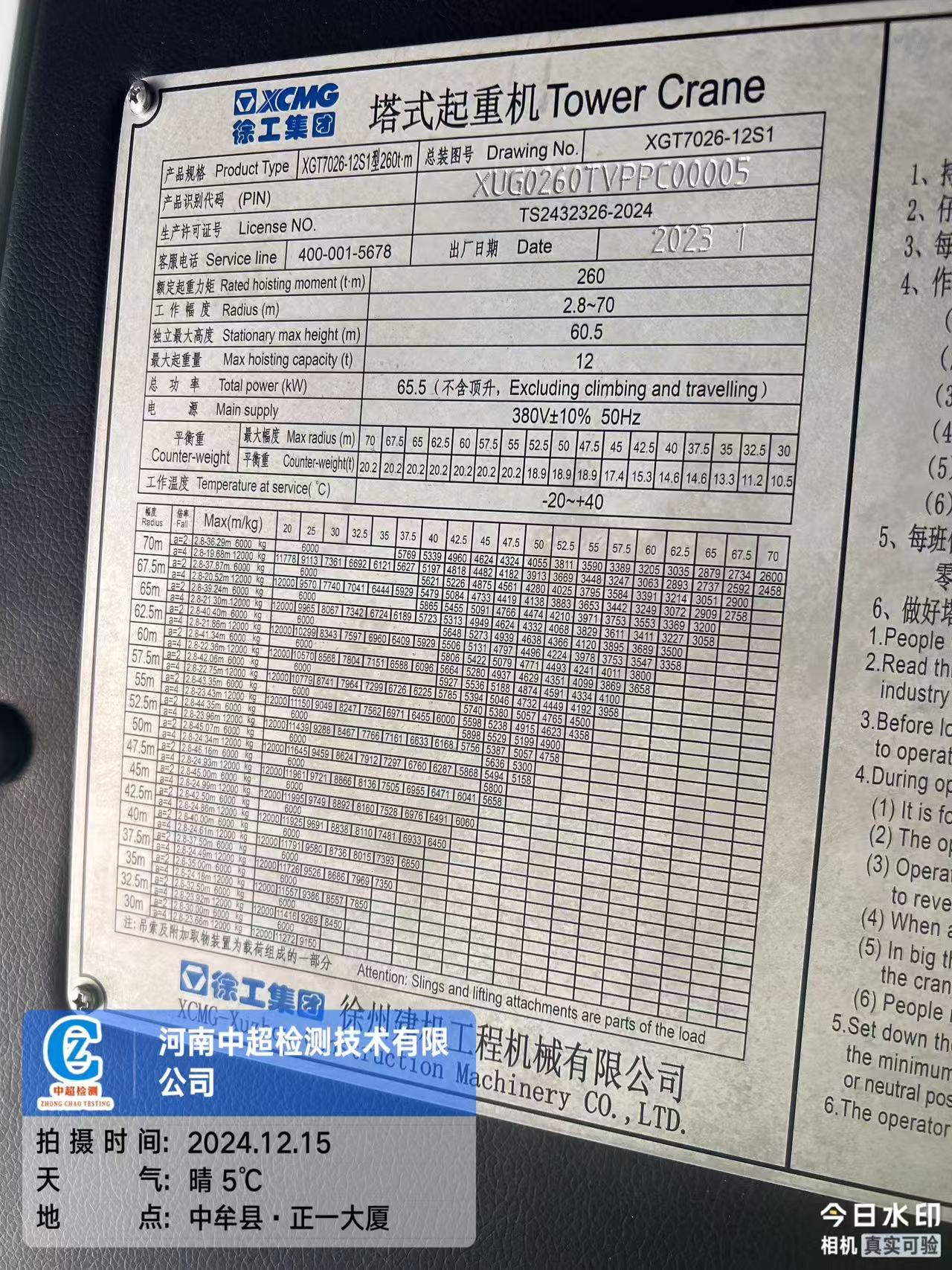 | 出厂编号:XUG0260TVPPC00005 | |