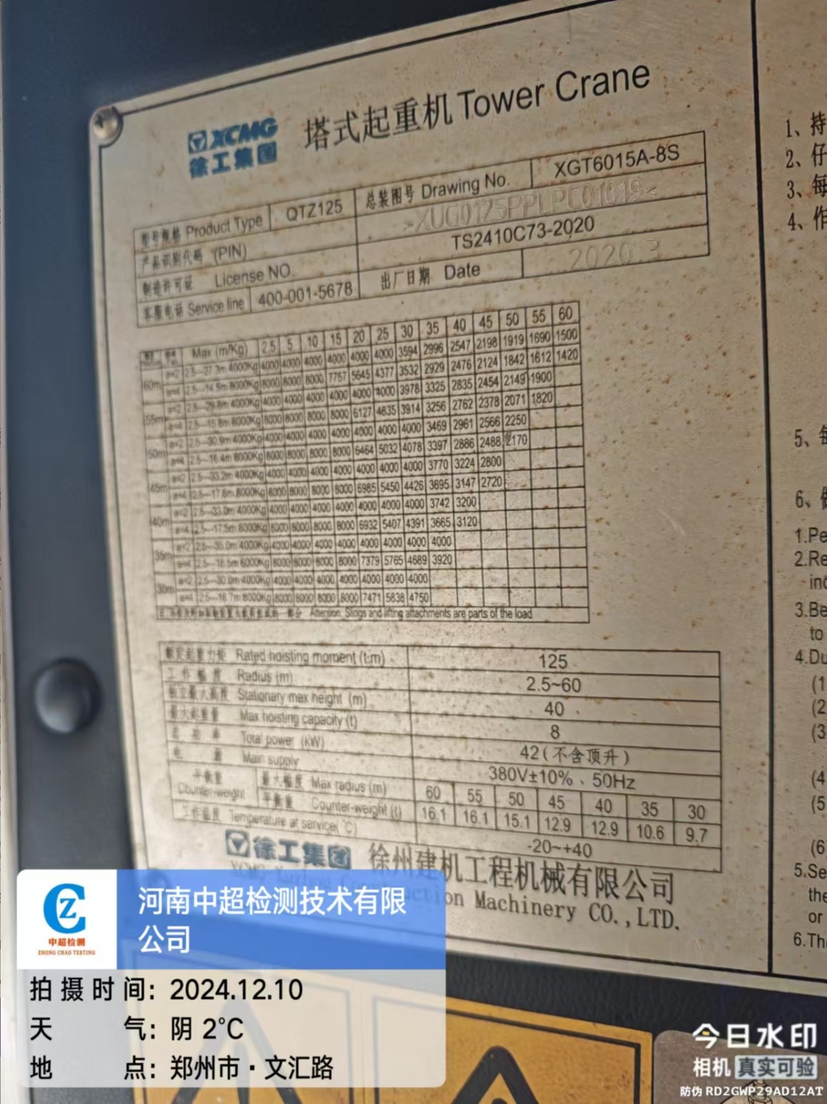 | 出厂编号:XUG0125PPLPC01019 | |