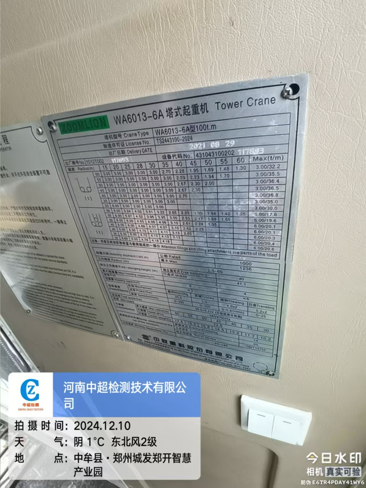 | 工程名称:城发郑开智慧产业园一期项目4#塔吊 | |