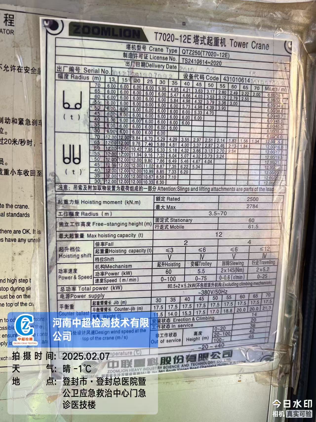 | 工程名称:登封市总医院暨公卫应急中心建设项目-门急诊医技楼(4#塔吊) | |